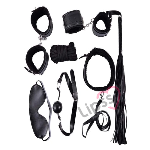 El-ayak kelepçesi, kırbaç, ağız topu, boyun tasması, göz bandı ve bağlama ipinden oluşan, 7 parçalı suni deri fetiş seti.
